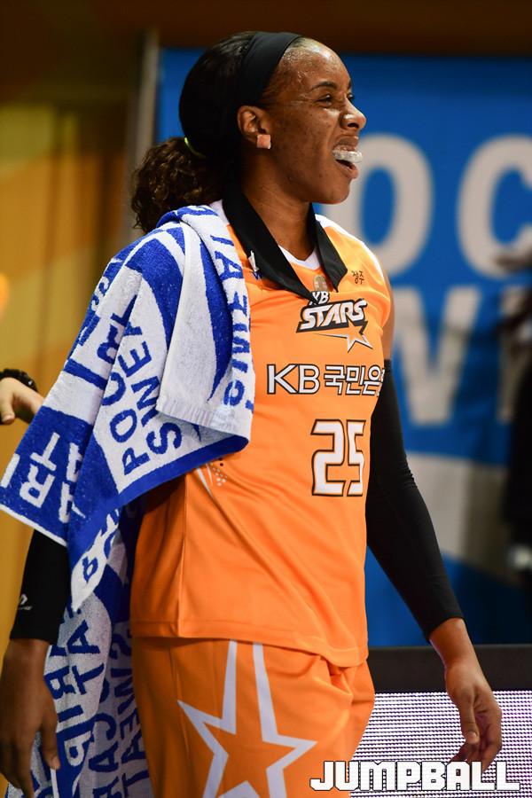 [점프볼=청주/박상혁 기자] 5일 청주실내체육관에서 우리은행 2018-2019 여자프로농구 정규리그 청주KB국민은행과 인천신한은행의 경기가 열렸다. KB 쏜튼이 코트바깥으로 나가는 사고를 당했음에도 불구하고 일어나서 벤치로 가고있다.