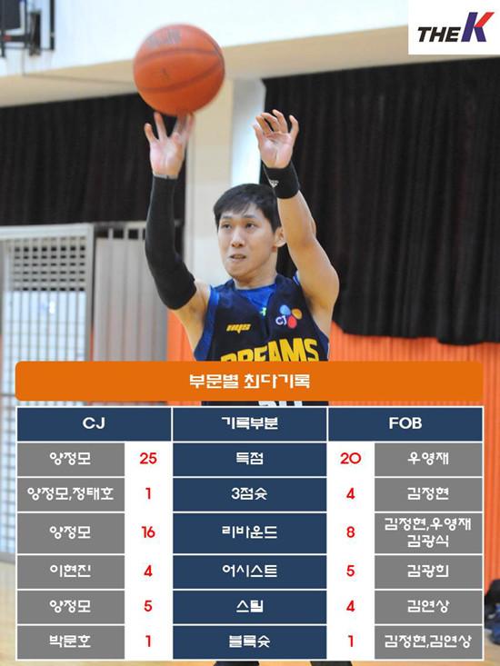승패보다 더 큰 그림을 그리고 있었던 CJ. 주포 이동윤이 개인사정으로 인하여 불참하였음에도 불구, 양정모를 중심으로 ‘뭉치면 살고 흩어지면 죽는다’는 격언을 몸소 실천하였다. 이광응이 모처럼만에 유니폼을 입은 가운데, 이현진(3점 4어시스트), 박문호(3점 4리바운드)가 중심을 든든히 잡아주었다. 한영석(10리바운드), 김승희(4점 9리바운드)는 양정모와 함께 골밑을 지켜내며 승리에 주춧돌을 놓았다. 정민진은 궂은일에 집중하며 동료들에게 힘을 불어넣었다.