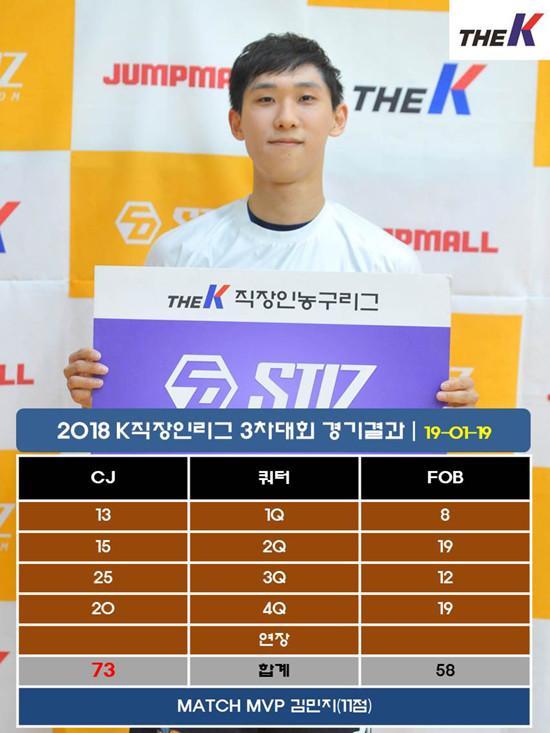CJ는 19일 서울 관악고등학교 체육관에서 열린 STIZ배 2018 The K직장인농구리그(www.kbasket.kr) 3차대회 디비전 2 3~4위전에서 양정모(25점 16리바운드 5스틸)를 필두로 김민지(11점), 이일(9점 3리바운드), 정태호(9점 3리바운드 3스틸), 모영근(8점) 등 고른 활약에 힘입어 FOB를 73-58로 잡고 유종의 미를 거두었다.
