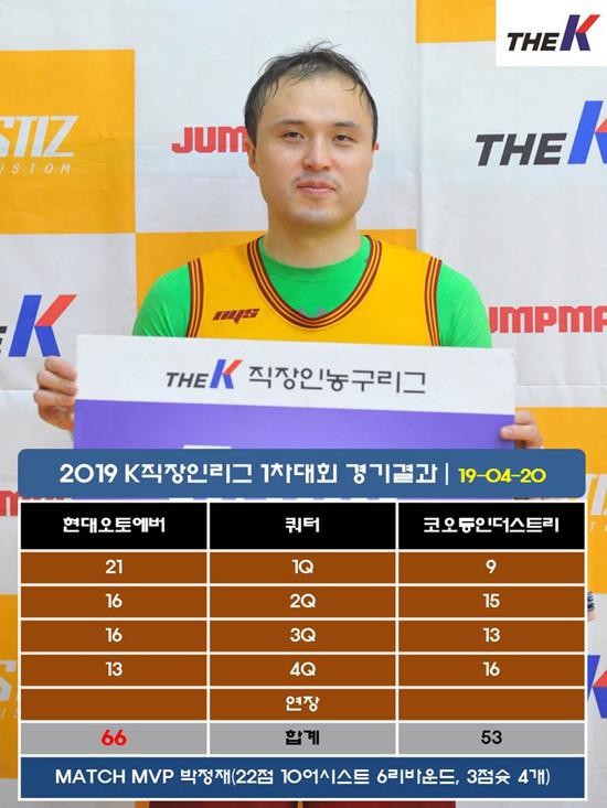 현대오토에버는 20일 서울 관악고등학교 체육관에서 열린 STIZ배 2018 The K직장인농구리그(www.kbasket.kr) 1차대회 디비전 1 예선전에서 3점슛 4개 포함, 22점 10어시스트 6리바운드를 기록하며 팀 공격을 이끈 박정재를 필두로 김용현(16점), 추광진(11점 5리바운드 3어시스트) 활약을 앞세워 코오롱인더스트리를 66-53으로 잡고 2연승을 내달렸다.