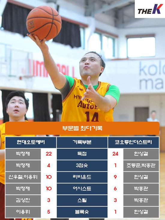 한편, 이 경기 STIZ(www.stiz.kr) 핫 플레이어에는 3점슛 4개 포함, 22점 10어시스트 6리바운드를 기록하며 팀을 진두지휘한 현대오토에버 야전사령관 박정재가 선정되었다. 모든 공격이 박정재 손에서 나온다고 해도 과언이 아니다. 약 5개월여간 담금질을 마쳤고, 스피드는 한층 더 빨라졌다. 이에 “김용현 대리가 합류함으로서 더 빨라진 덕에 쉽게 경기를 풀어나갔다”며 “김 대리가 원채 실력이 좋았다. 이전에는 속공에 나서면 추광진 대리가 따라왔는데 이제는 김용현 대리까지 뛰어들어오니 패스를 주는 입장에서 속공에 나서기 더 편해졌다. 경기를 거듭하면서 호흡도 점점 더 좋아지는 것 같다”고 김용현 합류를 반겼다.