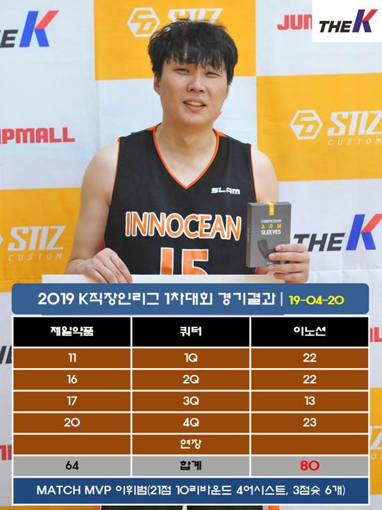 초반부터 제일약품 수비진을 거세게 몰아붙이며 15점 이상 점수차를 벌린 이노션. 후반 들어 제일약품 맨투맨 수비에 고전한 나머지 4쿼터 중반 56-59까지 좁혀지는 등 위기를 맞았다. 이에 “억지로 만들어서 하지 말고, 원래 우리가 잘 하는 플레이를 하자고 이야기했던 것이 잘 맞아떨어졌다. 우리 스타일을 살려 경기에 집중하자고 한 것이 주효했다”며 “상대가 수비를 맨투맨으로 바꾸며 내 쪽으로 마크가 쏠렸던 것 같다. 덕분에 조금은 쉬면서 할 수 있었던 것 같다. 대신, 다른 선수들이 많이 움직여주었다. 향후 유기적인 플레이를 보여주기 위해선 반드시 극복해야할 숙제로 남은 것 같다”고 말했다.