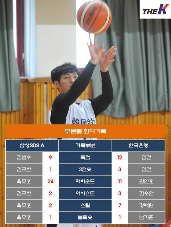 전, 후반 경기력이 눈에 띌 정도로 달랐다. 던지는 족족 들어가던 슛이 후반 들어 유독 말을 듣지 않았다. 한국은행을 위기에서 극복하게 된 원동력은 수비였다. 2-3 존 디펜스와 프레스를 번갈아가며 상대를 거침없이 압박했다. 권인호를 필두로 남기훈(4점 9리바운드 3스틸), 이대한이 개인사정으로 인하여 나서지 못한 오세윤 공백을 메우며 골밑을 든든히 지켜냈다. 백전노장 강배원은 김건, 김수한(2점 3리바운드 3어시스트), 박경석과 함께 코트를 종횡무진 누볐다. 임성운, 최영우, 이종원은 궂은일에 집중하여 팀 승리에 보탬이 되었다.