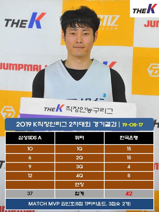 한국은행은 17일 서울 인헌고등학교 체육관에서 열린 STIZ배 2019 The K직장인농구리그(www.kbasket.kr) 2차대회 디비전 2 예선전에서 에이스 김건(12점 3리바운드, 3점슛 3개)을 필두로 권인호(8점 11리바운드), 박경석(6점 6리바운드)과 백전노장 강배원(6점 7스틸 3리바운드) 활약에 힘입어 삼성SDS A 추격을 42-37로 따돌리고 2연승을 내달렸다.