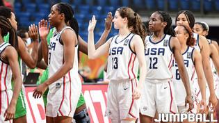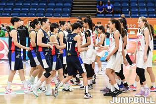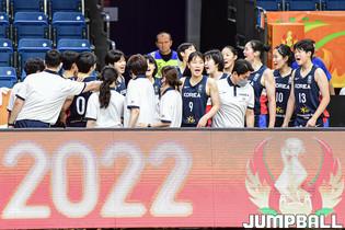 10일 헝가리 데브레첸 올라 가보 스포츠홀에서 열린 2022 FIBA U17 여자농구 월드컵 캐나다와의 조별 리그 2차전 경기, U17 여자농구 대표팀 고현지와 정현이 하이파이브를 하고 있다.