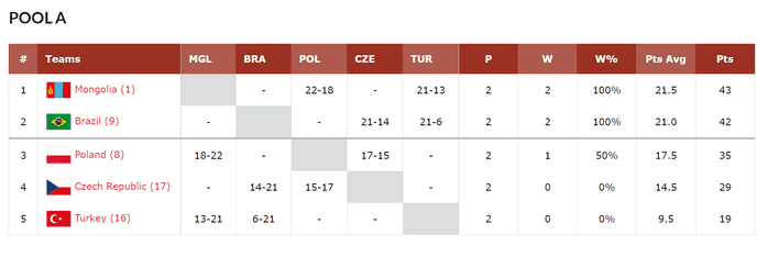 남자부에선 A조에 속한 몽골이 유럽의 폴란드, 터키를 연달아 꺾는 파란을 일으키며 2연승과 함께 A조 1위에 랭크됐다.