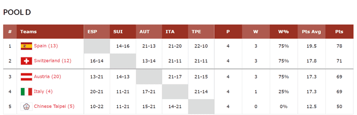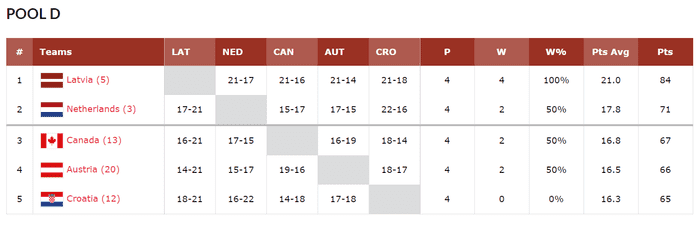 4경기에서 71점을 올린 네덜란드가 극적으로 조 2위로 올라서며 8강에 진출했고, 67점, 66점을 올린 캐나다와 오스트리아는 8강 진출에 실패했다.