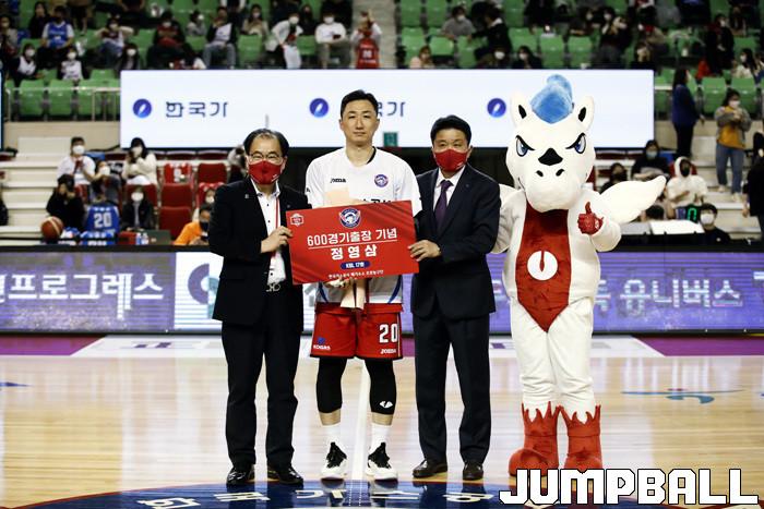 2008~2009시즌 데뷔해 14번째 시즌을 보낸 정영삼은 대구 팬들이 지켜보는 이날 하프 타임 때 정규리그 통산 600경기 출전 기념상을 수상했다.
