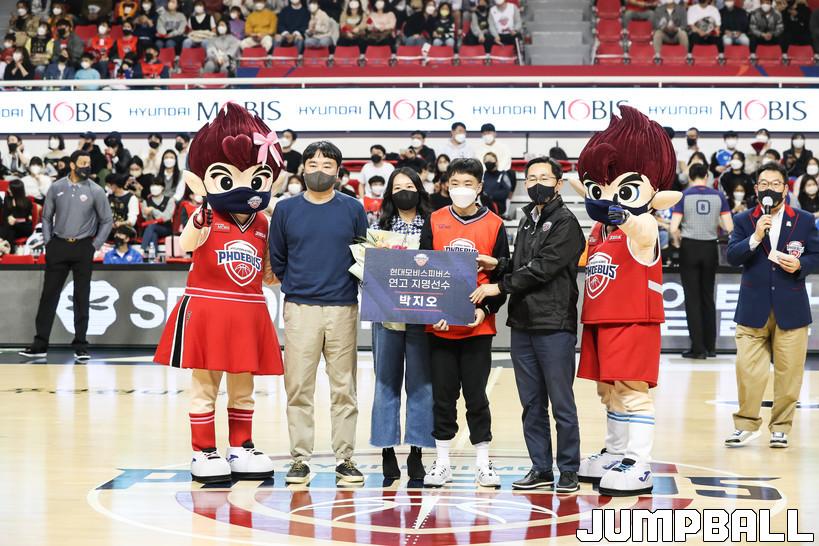 울산 현대모비스는 지난 26일 대구 한국가스공사와 홈 경기 하프타임 때 박지오(휘문중)를 연고 선수로 지명한 걸 축하하는 행사를 가졌다.