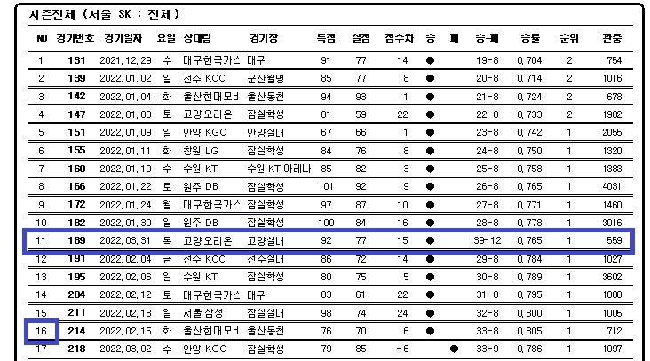 SK가 15연승을 달릴 때 고양 오리온과 경기가 뒤로 밀렸고, 이 경기는 지난달 31일 열렸다. SK는 오리온에게 승리했기에 경기번호상으론 15연승이 아닌 16연승이 된다.