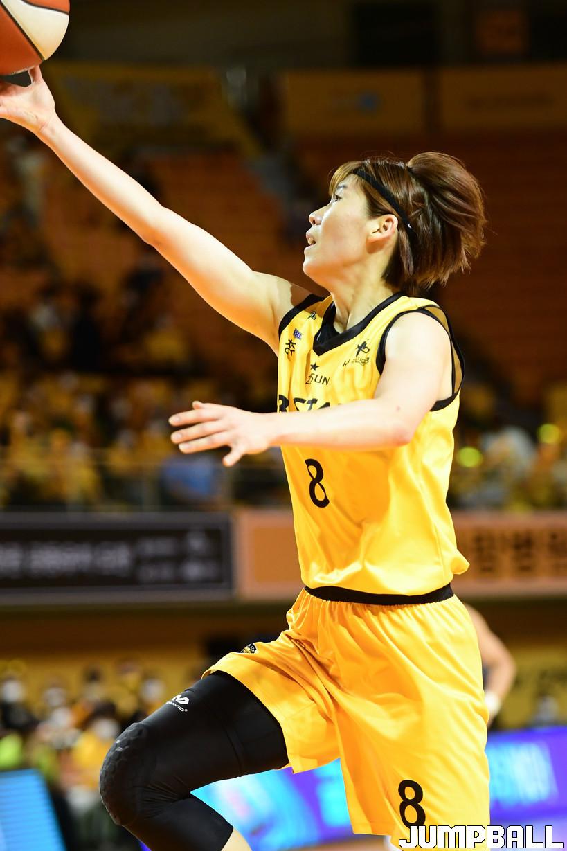 이후, 김민정은 득점이 다소 수그러들긴 했지만 투지 넘치는 플레이로 리바운드에 적극 가담하며 팀 플레이를 도왔다. 이외에도 동료들의 찬스를 살피고, 스틸로 분위기를 전환하는 등 기록지를 꽉 채우는 활약을 펼쳤다.
