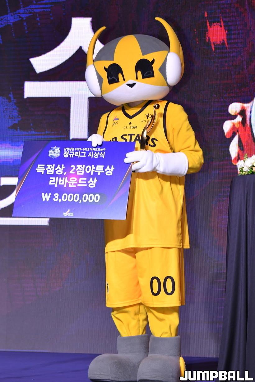 하지만 박지수는 코로나19 확진 판정을 받고 자가격리에 들어가 시상식에는 불참했다. 이에 KB스타즈의 마스코트 스타비가 대리 수상했다.