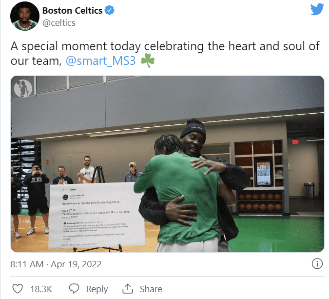 NBA는 19일(한국시간) 공식 홈페이지, SNS 등을 통해 스마트의 2021-2022시즌 NBA 올해의 수비수 선정 소식을 전했다. 스마트는 257점을 기록하며 미칼 브릿지스(피닉스, 202점)와 루디 고베어(유타, 136점)를 여유 있게 제쳤다.