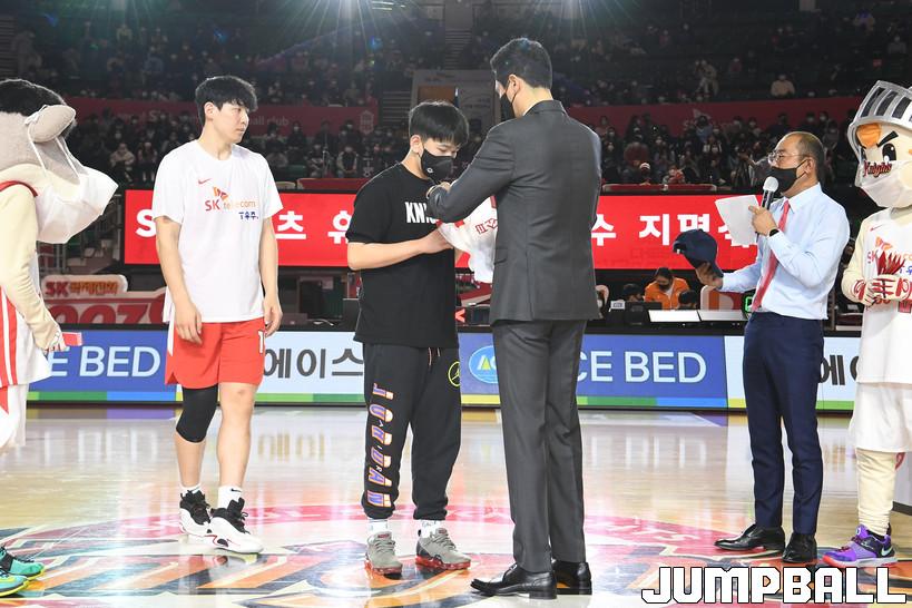 5일 잠실학생체육관에서 열린 2021-2022 KGC인삼공사 정관장 프로농구 서울 SK와 창원 LG의 올 시즌 다섯 번째 맞대결. 이날 하프타임에는 미래의 기사단을 이끌 한 선수가 홈팬들 앞에서 첫 인사를 건넸다.
