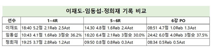 이재도는 SK와 6강 플레이오프에서 8분 51초만 뛰고도 정규리그와 비슷한 4.7점을 올렸다.
