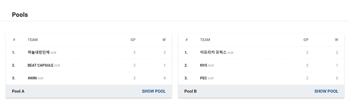 [점프볼=양산/김지용 기자] 25일 양산실내체육관에서 개막한 KB국민은행 LiiV 3x3 코리아투어 2020 양산대회 1일차 코리아리그의 경기 결과이다. 이번 대회 코리아리그에는 총 7팀이 모여 예선을 치렀고, 하늘내린인제, 아프리카 프릭스, 비트캡슐, NYS가 4강 진출에 성공했다.