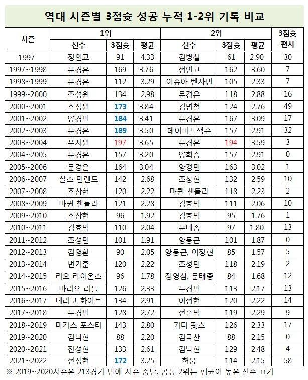 현재 한 시즌 기준 최다 3점슛 성공 1,2위는 2003~2004시즌 우지원과 문경은이 기록한 197개와 194개다.
