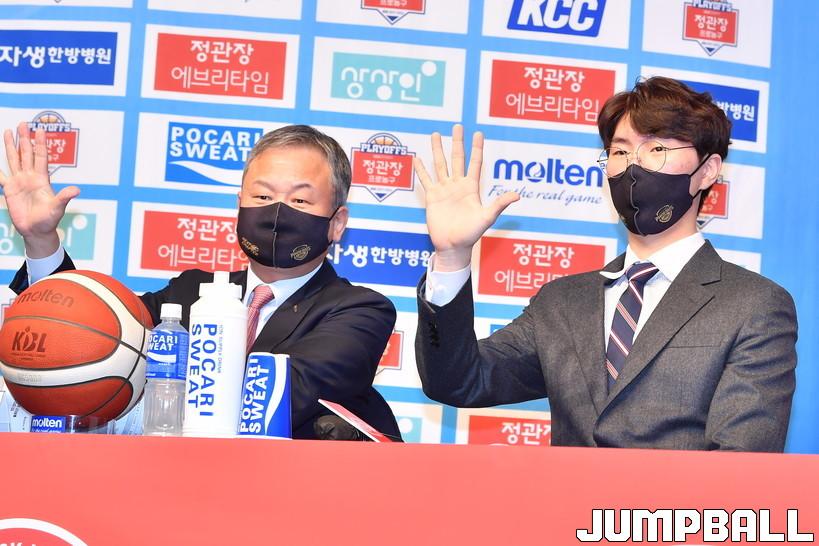 업셋을 노리는 가스공사 유도훈 감독과 김낙현은 손가락 5개를 보였다. 유도훈 감독은 “상대가 지난 시즌 우승팀이다. 이번 시즌에 전력이 약해졌다고 하는데 좋은 팀이기 때문에 도전한다는 입장으로 5차전까지 가야 승리한다고 예상한다”고 이야기했다.