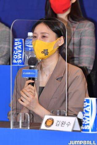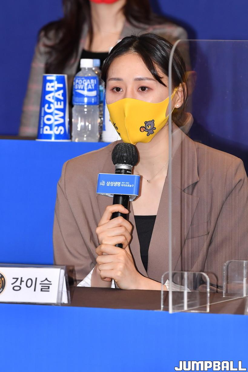 28일 서울 여의도 63컨벤션센터 4층 라벤더&로즈마리홀에서 열린 '삼성생명 2021-2022 여자프로농구 플레이오프 미디어데이', KB 강이슬이 출사표를 전하고 있다.