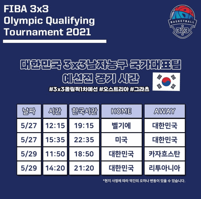 오는 5월26일부터 30일까지 오스트리아 그라츠에서 열리는 2020 도쿄올림픽 3x3 1차 예선에 나서는 한국 남자 3x3 대표팀은 미국, 리투아니아, 벨기에, 카자흐스탄과 함께 B조에 편성돼 8강 진출을 다툴 예정이다.
