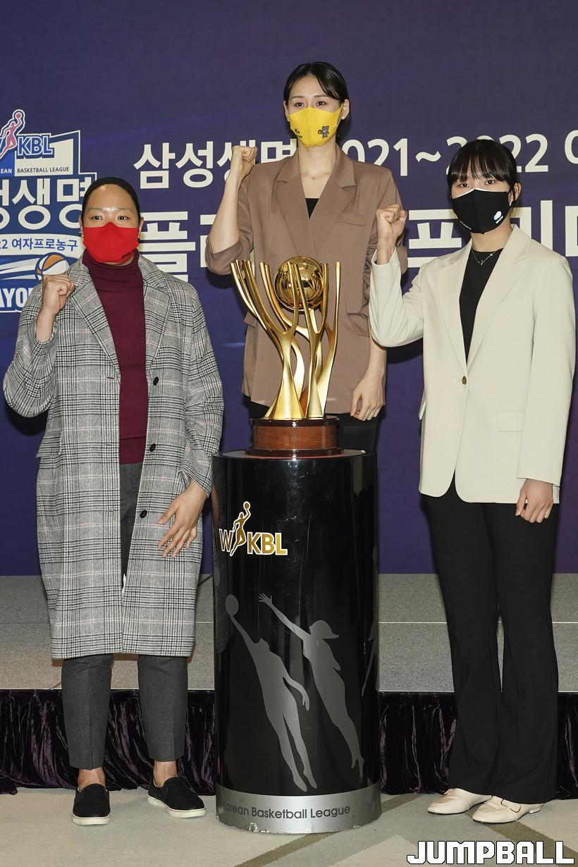 28일 서울 여의도 63컨벤션센터 4층 라벤더&로즈마리홀에서 열린 '삼성생명 2021-2022 여자프로농구 플레이오프 미디어데이', KB 강이슬, 우리은행 박지현, BNK 김한별이 화이팅을 외치며 기념촬영을 하고 있다.