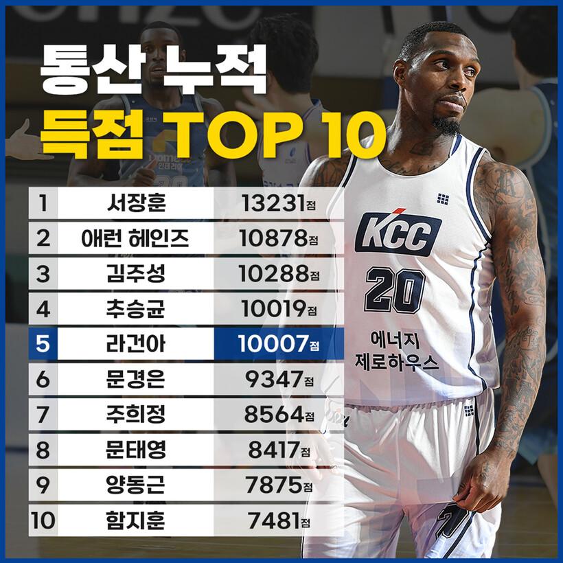 지난해 12월 29일 군산월명체육관에서 전주 KCC와 대구 한국가스공사의 경기가 열렸다. 라건아는 통산 1만 득점을 기록했고, 라건아를 앞세운 KCC는 접전 끝에 82-73으로 승리했다. 점프볼은 라건아의 1만 득점을 축하하고, 역대 통산 득점 순위를 알아보는 카드뉴스를 준비했다. 팬들은 라건아의 1만 득점을 축하하면서 ‘곧 2위에 있는 애런 헤인즈의 1만 878점 을 채울 수 있을 거다’라고 응원 댓글을 남겼다. 또 1위 서장훈의 1만 3231점 기록에 ‘서장훈 그는 대체..’라는 댓글이 달려 서장훈의 위엄 또한 돌아볼 수 있었다.
