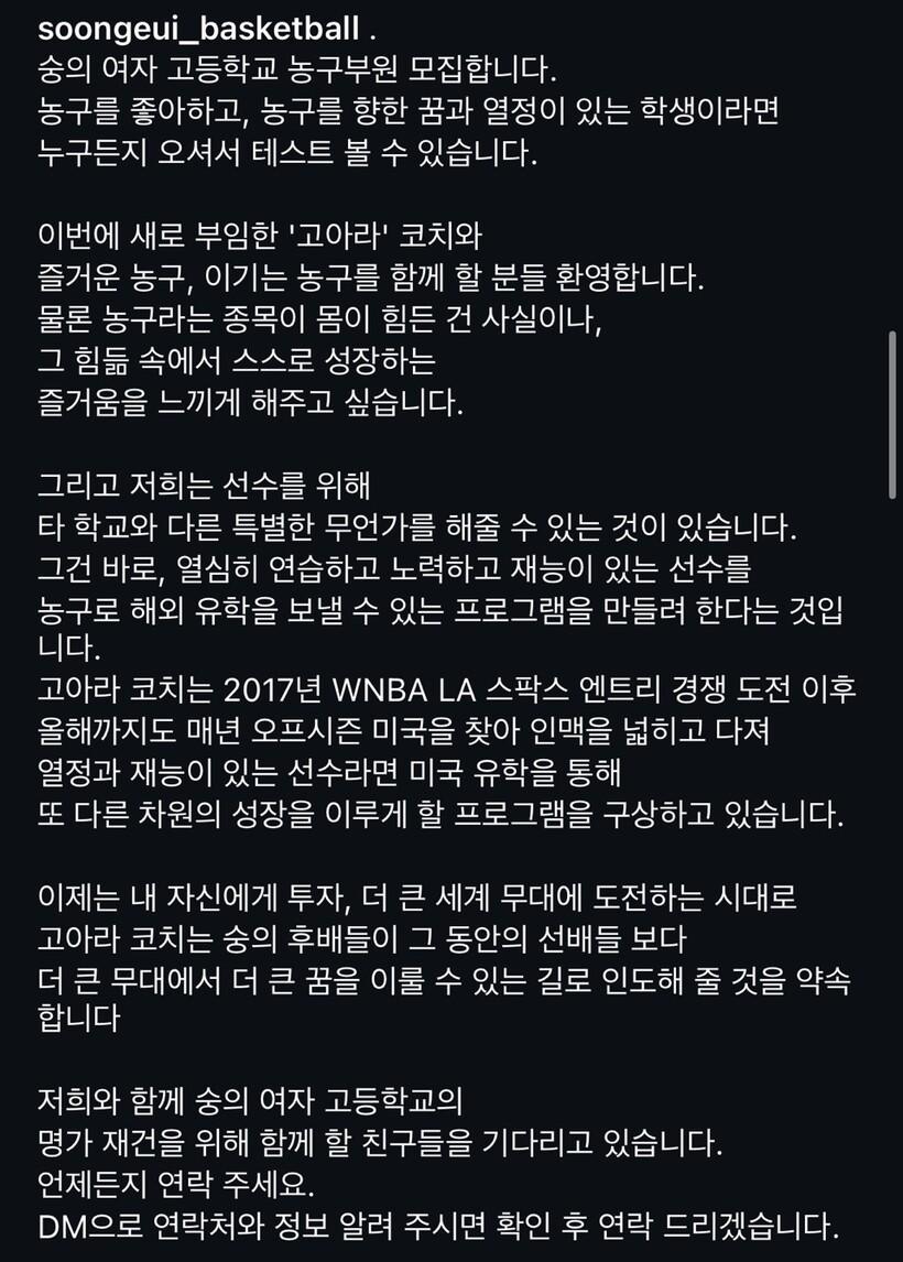 모교에 닥친 위기를 보고만 있을 수 없었던 고아라 코치가 현재 선수를 모으기 위해 이곳저곳에서 뛰고 있다. 다행히 같이하는 이들이 많다. 선후배를 가리지 않고 너도나도 숭의여고 농구부원 모집 공고를, 소셜미디어를 통해 공유 중이다.
