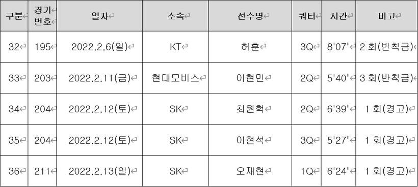 [점프볼=서호민 기자] KBL은 통합웹사이트(www.kbl.or.kr)를 통해 2021-2022 KGC인삼공사 정관장 프로농구 5라운드 페이크 파울 명단을 공개했다.