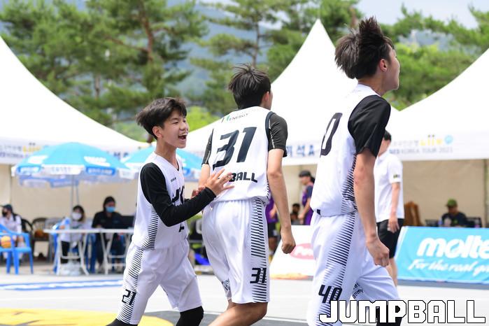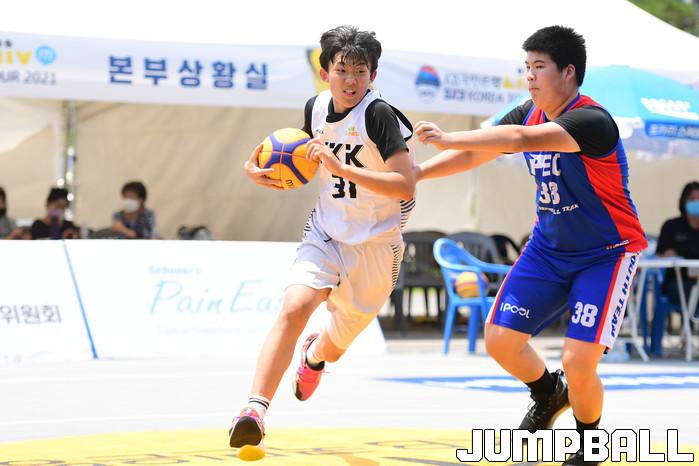 20일 강원도 양구군 청춘체육관 앞 특설코트에서 열린 KB국민은행 Liiv M 3x3 코리아투어 2021 2차 양구대회(이하 코리아투어) 중등부 결승전에서 주현성과 이예찬의 높이가 위력을 발휘한 원주 YKK A가 PEC를 12-9로 꺾고 중등부 우승을 차지했다.