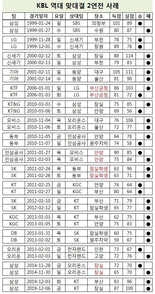 두 팀이 연이어 맞대결을 갖는 건 KBL 역대 18번째다. 각 팀들은 한 시즌 6번씩 대결하는데 라운드 마지막 경기와 다음 라운드 첫 경기가 배정되면 이런 사례가 간혹 나온다.