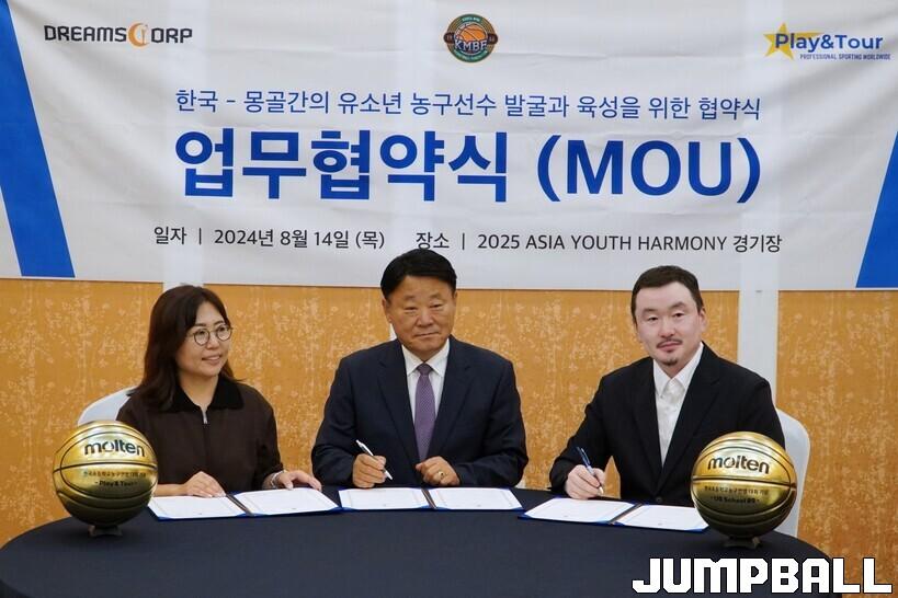 | ▲왼쪽부터 드림스코프 장은하 부사장, 한국초등농구연맹 오재명 회장, PLAY&TOUR 대표 순두이 운드라흐바트 |