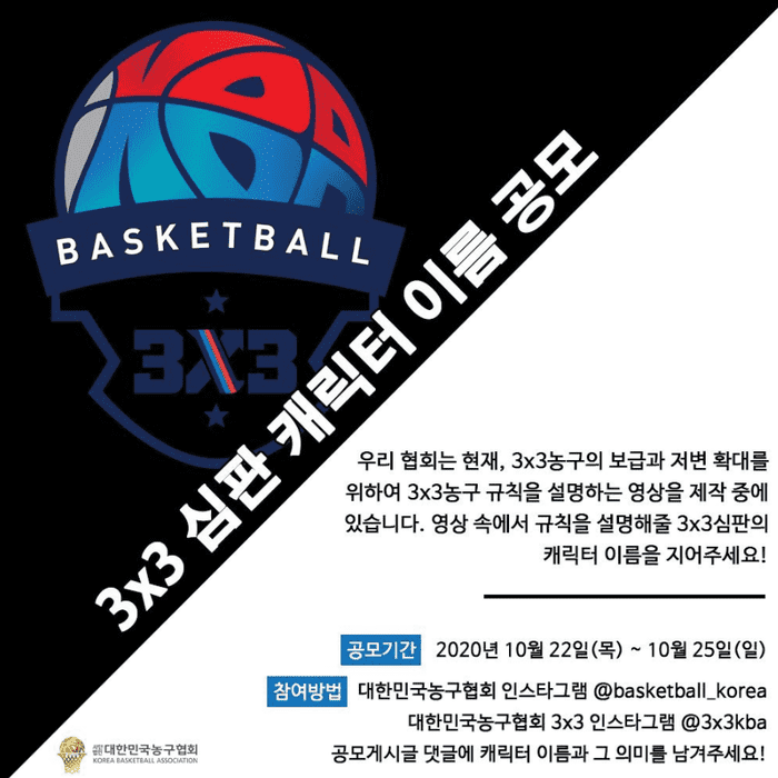 3x3 농구의 보급과 활성화를 위해 3x3 농구 규칙 영상을 제작할 예정인 협회는 영상 제작에 앞서 코리아투어 SNS를 통해 영상에서 3x3 규칙을 설명하는 심판 캐릭터 이름을 공모하기로 했다.