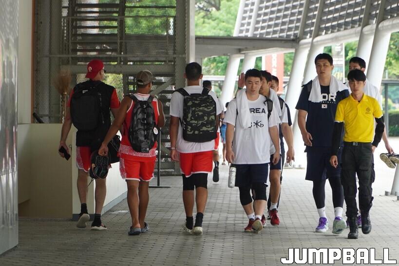 오후 1시 5분 남자 대표팀의 첫 경기가 열리는 시간. 대표팀은 1시간 전에 대회장을 찾았고, 전날 몸을 푼 OCBC 아레나 웜업 코트장에서 몸을 풀었다. 어제와는 다른 눈빛. 대회 진행을 돕는 현지 자원봉사자들이 안내한다.