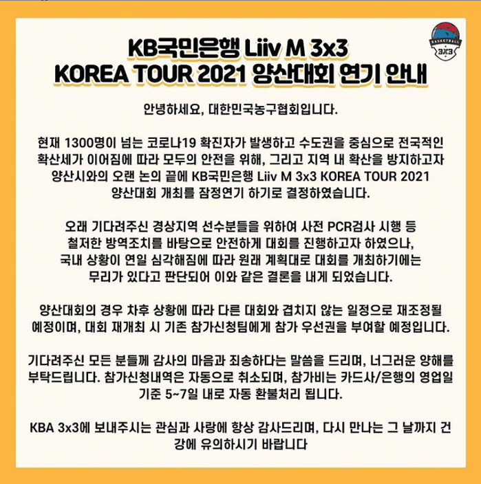 금주 17일과 18일 이틀간 경남 양산시에서 개최 예정이었던 KB국민은행 Liiv M 3x3 코리아투어 2021 양산대회가 대회 개최를 5일 앞두고 전격 연기됐다.