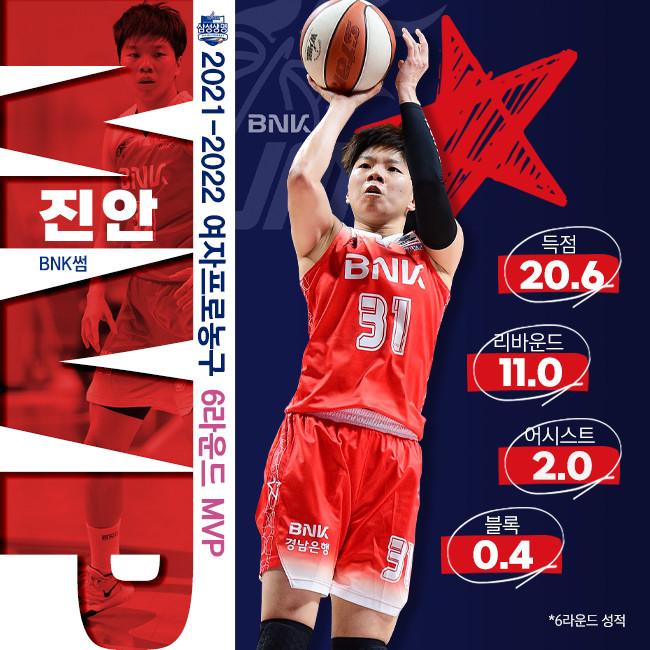 WKBL은 30일 삼성생명 2021~2022 여자프로농구 정규리그6라운드 MVP 투표 결과를 발표했다. 진안은 언론사 기자단 투표에서 80표 가운데 68표를 획득, 박지현(우리은행·9표)과 신지현(하나원큐·3표)를 여유 있게 제쳤다.