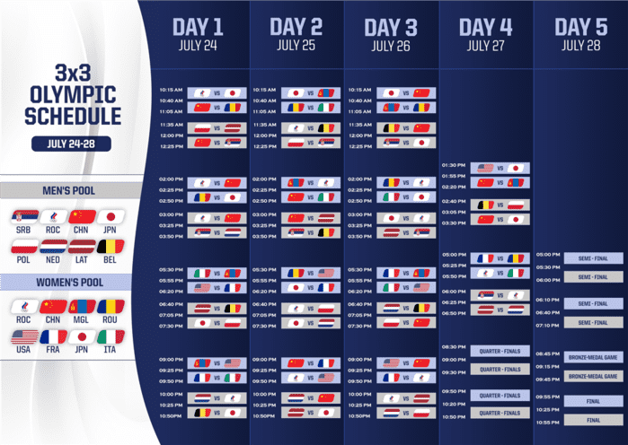 24일부터 27일까지 치러지는 예선은 매일 오전 10시에 시작해 오후 10시50분에 마지막 경기를 치른다. 각 조별로 구분된 한 세션당 4경기씩 매일 총 4세션으로 나눠져 있는 예선 일정 중간중간에는 1시간30분 정도의 브레이크 타임이 있어 심판이나 관계자들에게는 충분한 휴식 시간이 주어질 예정이다. 3x3 예선은 4일에 걸쳐 총 56경기가 치러진다.