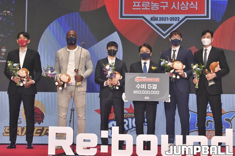 6일 그랜드 인터컨티넨탈 서울 파르나스 그랜드볼룸에서 열린 2021-2022 KGC인삼공사 정관장 프로농구 정규리그 시상식. 문성곤(KGC), 정성우(KT), 이승현(오리온), 머피 할로웨이(오리온), 차바위(가스공사)가 수비 5걸에 선정됐다.