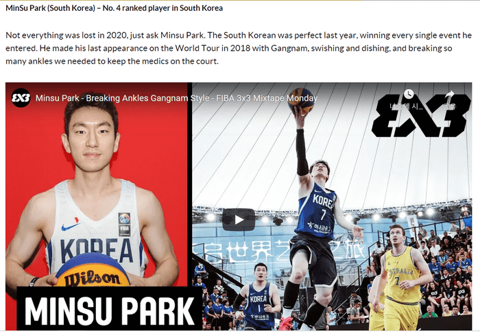 FIBA는 “(코로나19로 인해) 2020년 모든 것을 잃은 것은 아니다. 박민수에게 물어보라. 지난해 한국에서 그는 완벽했고, 그가 참가한 모든 대회에서 우승했다. 그는 FIBA 3x3 우쓰노미야 월드투어 2018에서 화려한 플레이로 코트를 장식했고, 수많은 앵클 브레이크 장면을 연출했다”며 박민수를 설명했다.