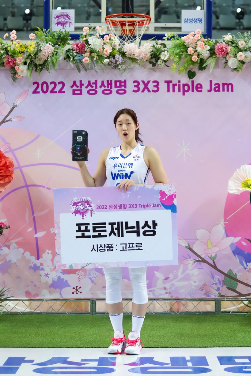 아산 우리은행 오승인은 23일 서울 장충체육관에서 열린 2022 삼성생명 3x3 트리플잼 1차 대회에서 포토제닉상을 수상했다. 그는 이수정(삼성생명), 정예림(하나원큐)과 최종 후보 3인에 올랐고, 팬들의 지지를 받아 포토제닉상의 주인공으로 결정됐다.