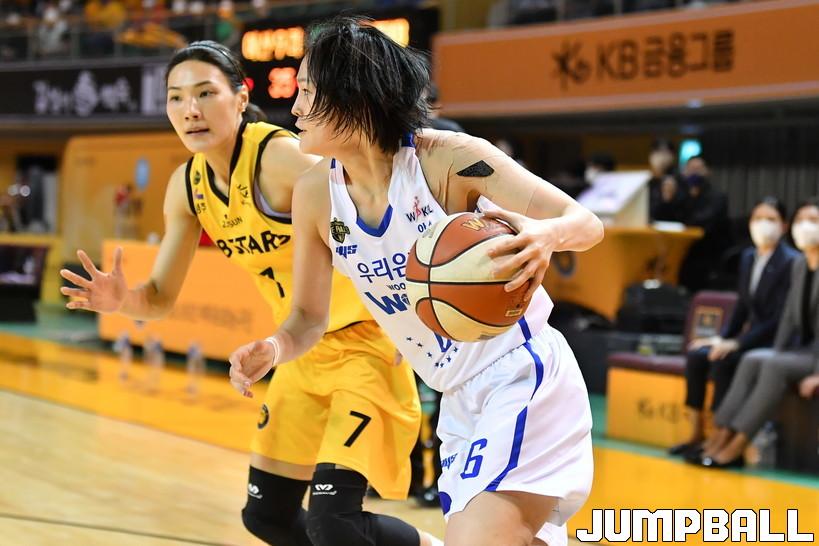 10일 청주실내체육관에서 열린 '삼성생명 2021-2022 여자프로농구 챔피언결정전 1차전' 청주 KB와 아산 우리은행의 경기. 우리은행 최이샘이 골밑으로 돌파를 시도하고 있다.