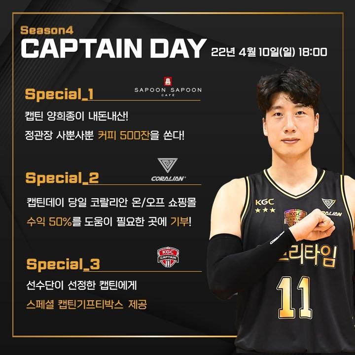 구단은 올해로 4회째를 맞는 ‘캡틴데이’에서 디펜딩 챔피언의 ‘RE-PEAT’을 위한 다채로운 행사를 진행한다. 우선 양희종 선수가 KGC인삼공사의 브랜드인 ‘사푼사푼’에서 커피 500잔을 경기 중 이벤트를 통해 팬들에게 제공한다. 또한 구단 SNS를 통해 진행하고 있는 ‘당신도 캡틴’ 이벤트 당첨자에게는 ‘캡틴기프트 박스’를 선물할 예정이다.