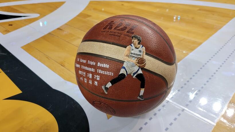 | ▲김시래(삼성)의 프로 첫 트리플더블 기념 제작 커스텀 농구공 |