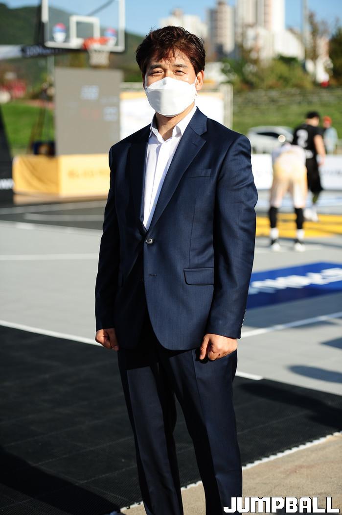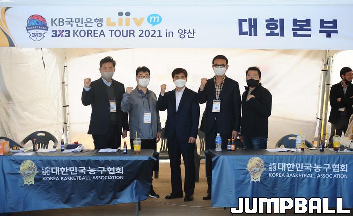 23일 경남 양산시 양산천인라인스케이트장 특설코트에서 열리고 있는 KB국민은행 Liiv M 3x3 코리아투어 2021 3차 양산대회(이하 코리아투어) 경기장에 정상열 양산시체육회장이 방문해 선수들을 격려했다.