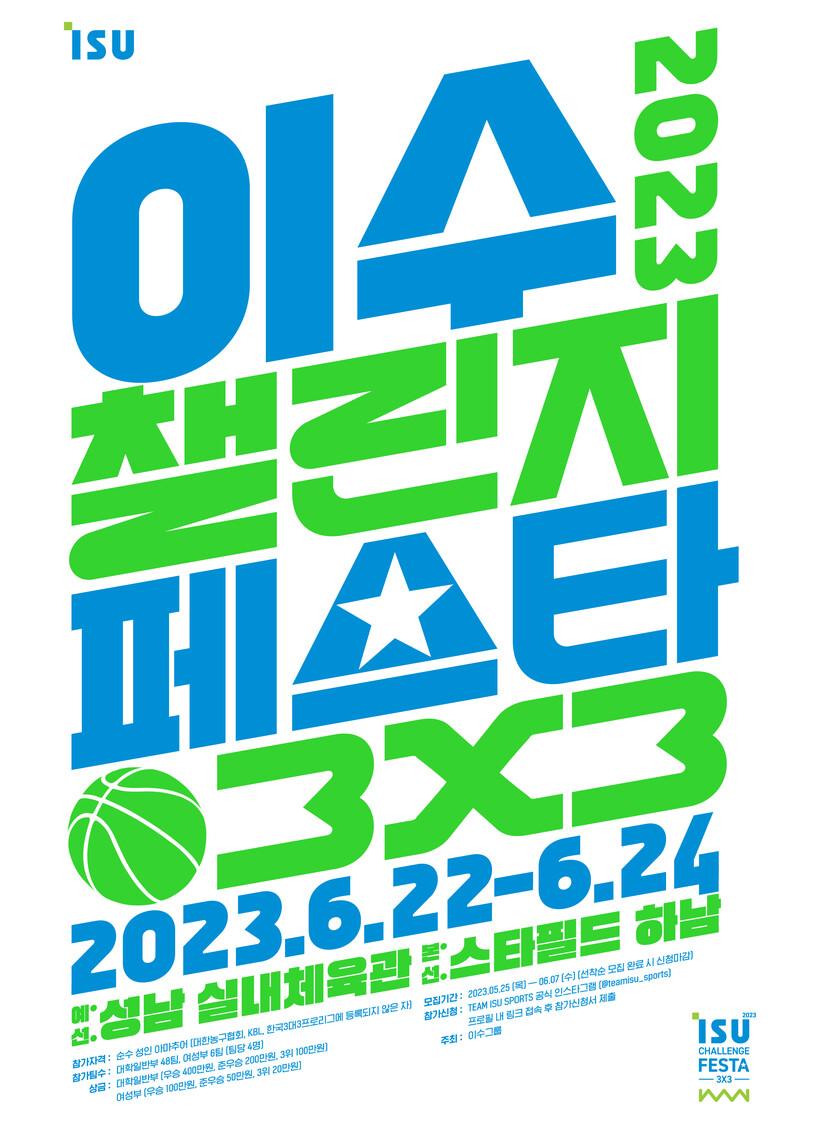 이수그룹은 오는 6월 22일부터 24일 사흘 간 성남 실내체육관(예선)과 하남 스타필드(본선)에서 대학일반부 아마추어 팀들을 대상으로 하는 3x3 농구대회 ‘2023 이수챌린지페스타 3x3’을 개최한다고 밝혔다.