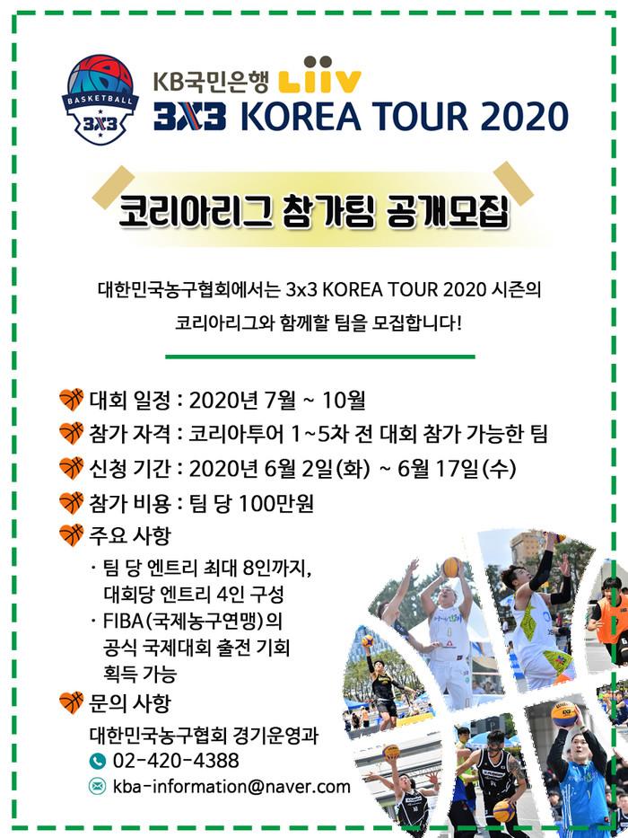 대한민국농구협회는 KB국민은행 리브(LiiV) 3x3 KOREA TOUR 2020 코리아리그에 참가할 팀을 모집한다. KOREA TOUR는 대한민국농구협회가 주최하고 문화체육관광부, 국민체육진흥공단, KB국민은행 후원으로 진행되는 국내 최고의 3x3대회다.