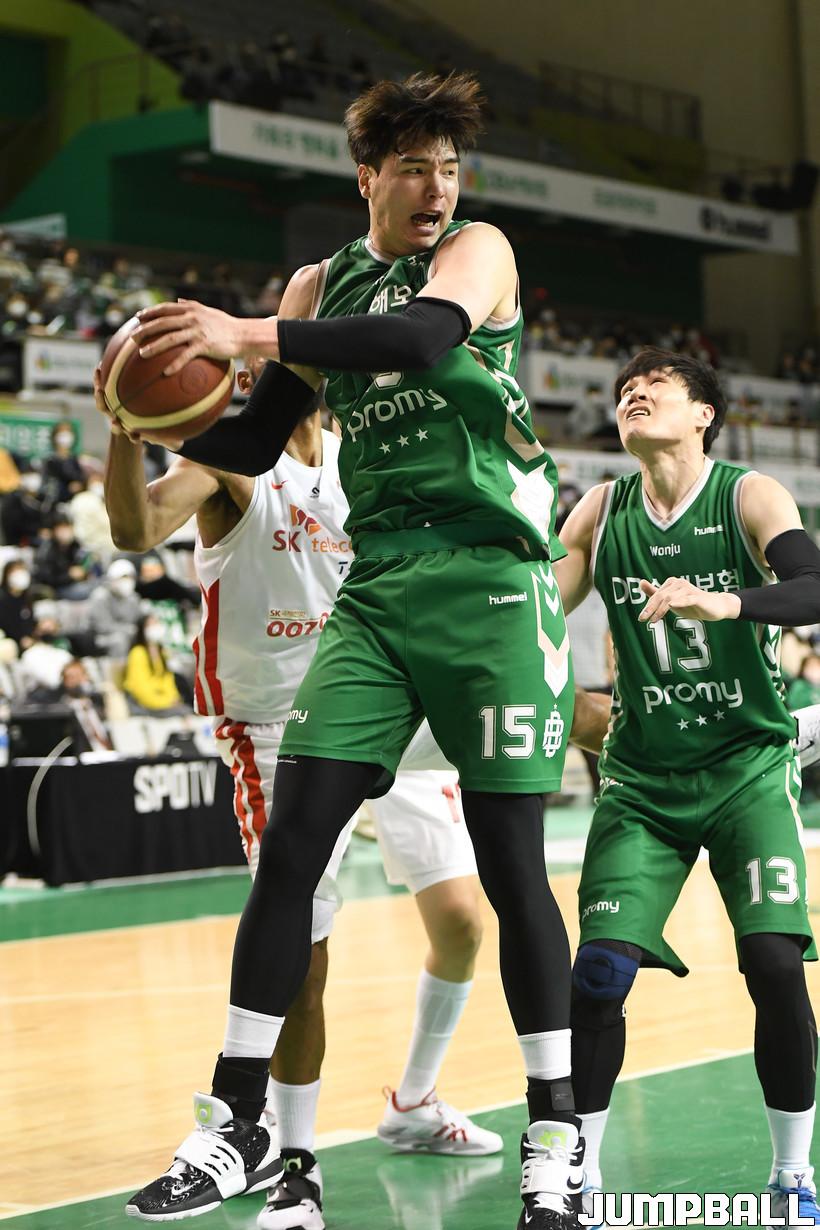 6일 원주종합체육관에서 열린 2021-2022 KGC인삼공사 정관장 프로농구 원주 DB와 서울 SK의 경기, DB 김종규가 리바운드를 잡아내고 있다.