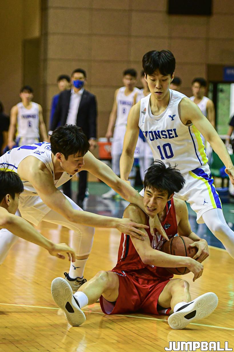 25일 단국대 천안캠퍼스 체육관에서 열린 2022 KUSF 대학농구 U-리그 단국대와 연세대의 경기, 단국대와 연세대 선수들이 루즈볼 다툼을 하고 있다.