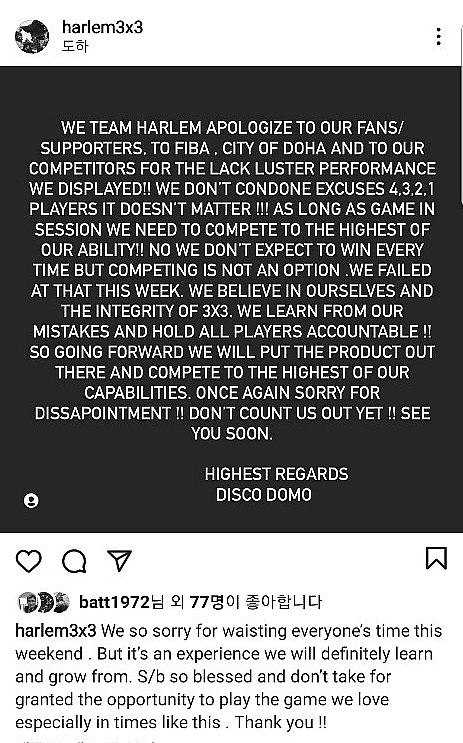 선수들 스스로가 가장 큰 실망을 했을 뉴욕 할렘은 도하 월드투어에서 예선 탈락한 뒤 팀 SNS를 통해 사과문을 게재했다.