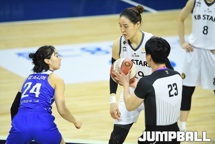 14일 아산 이순신체육관에서 열린 '삼성생명 2021-2022 여자프로농구 챔피언결정전 3차전' 아산 우리은행과 청주 KB스타즈의 경기, KB 박지수와 우리은행 김소니아가 점프볼을 준비하고 있다.