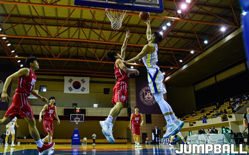 25일 단국대 천안캠퍼스 체육관에서 열린 2022 KUSF 대학농구 U-리그 단국대와 연세대의 경기, 연세대 김보배가 골밑에서 슛을 시도하고 있다.